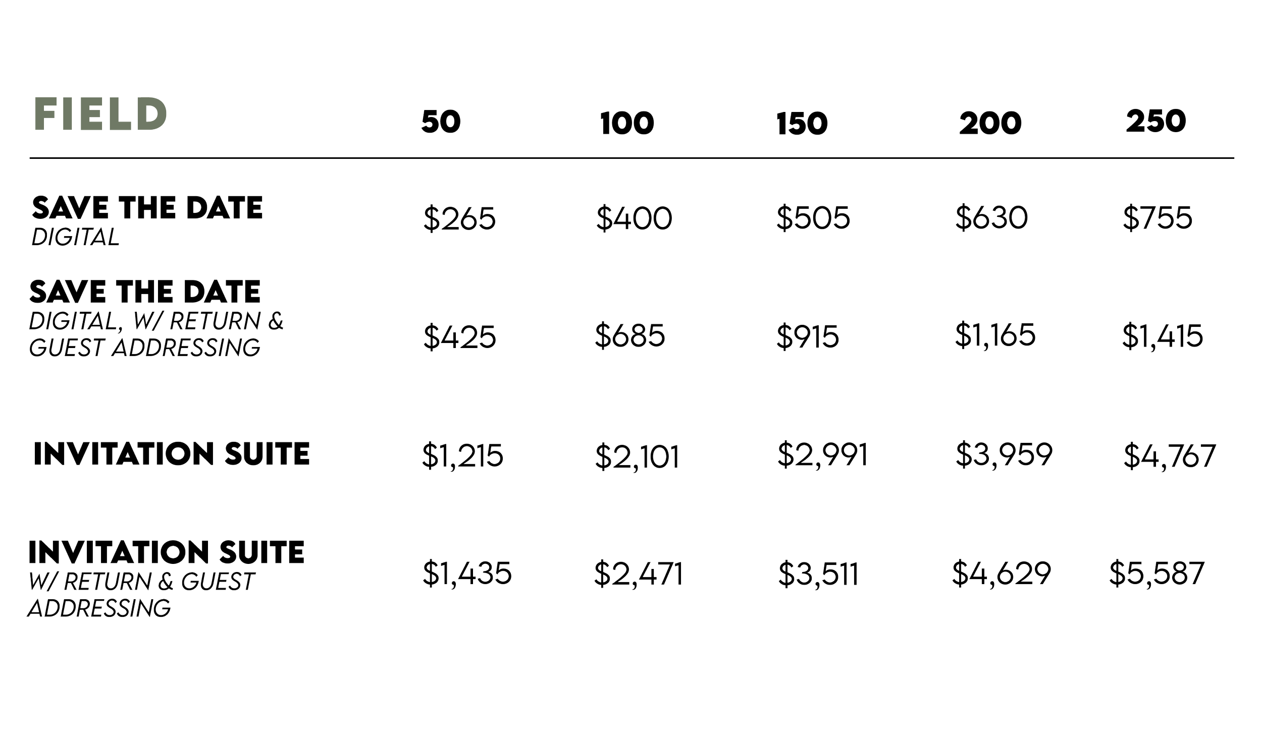 The semi-custom Field suite is for the couple planning a celebration that reflects a love for simplicity and natural beauty. The earthy color palette and wording, print process, minor layout changes, and envelope colors are customizable.